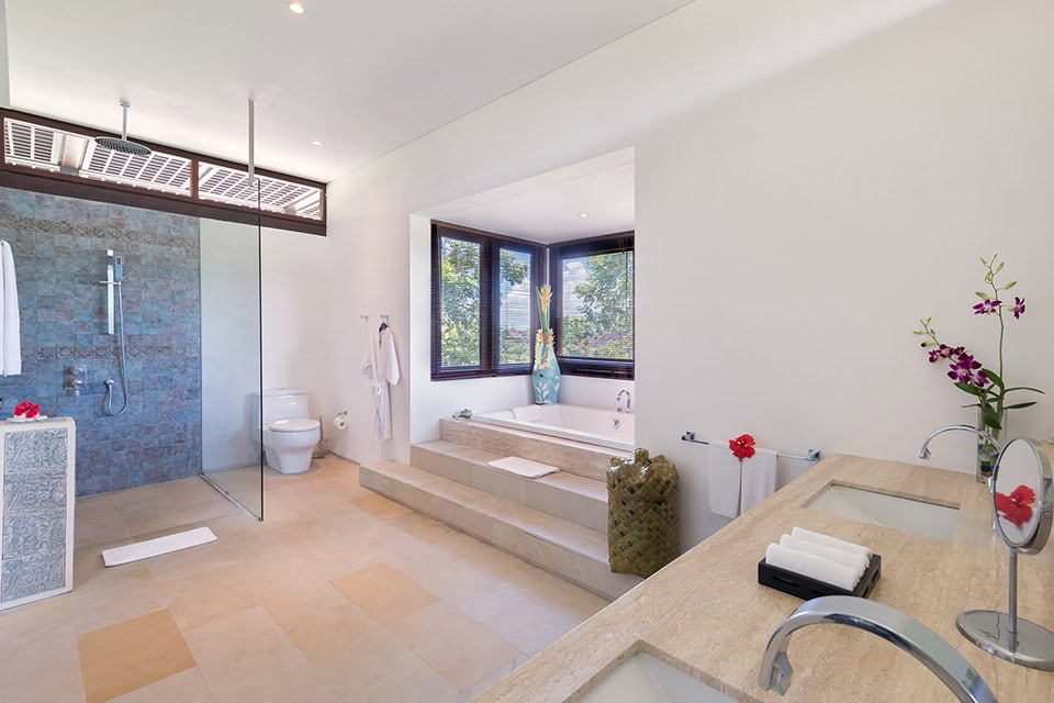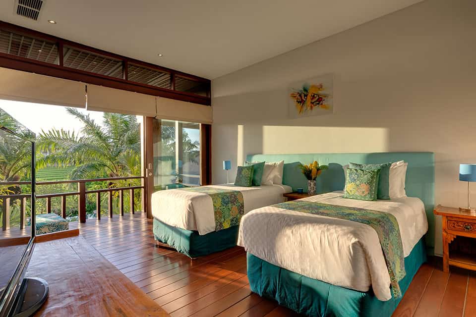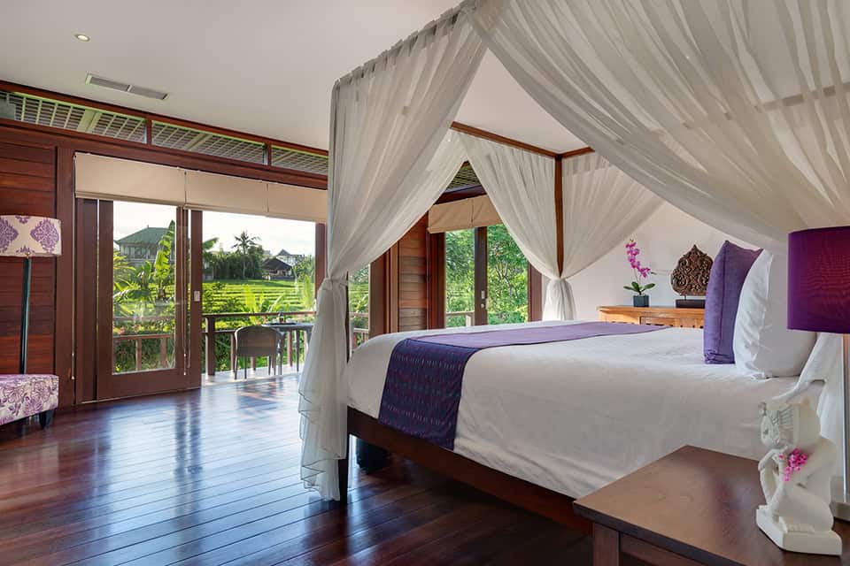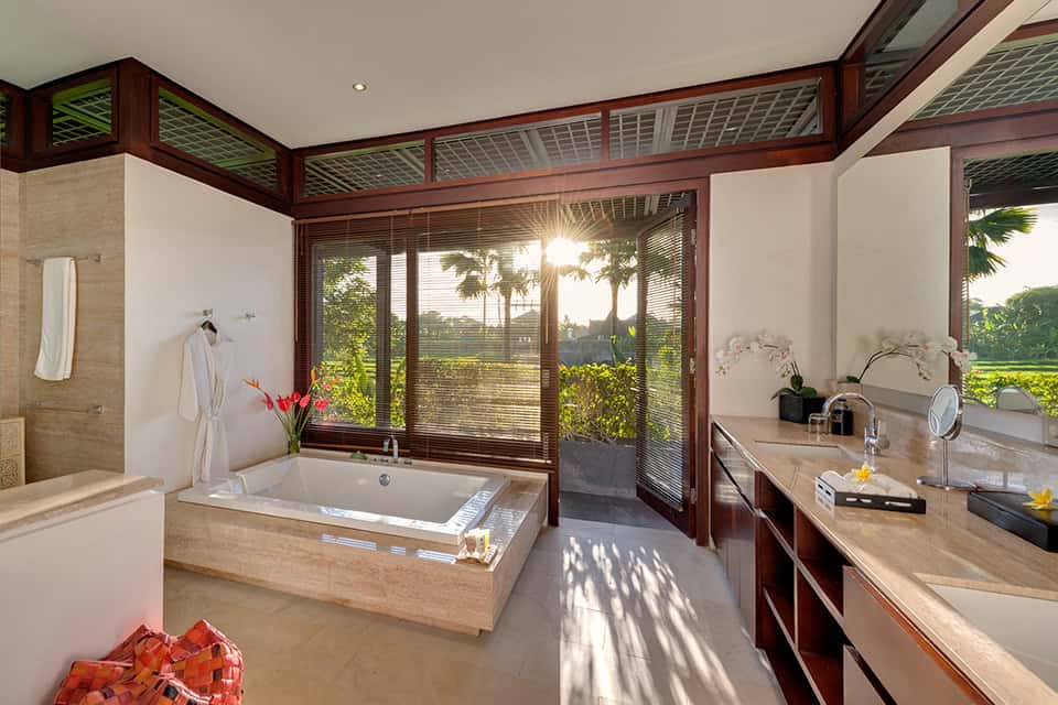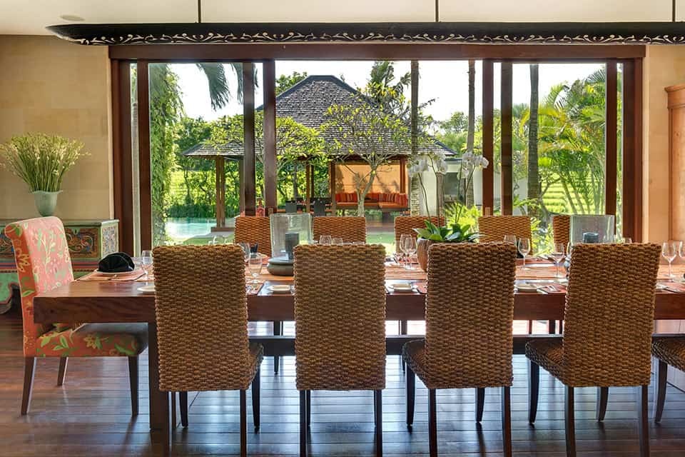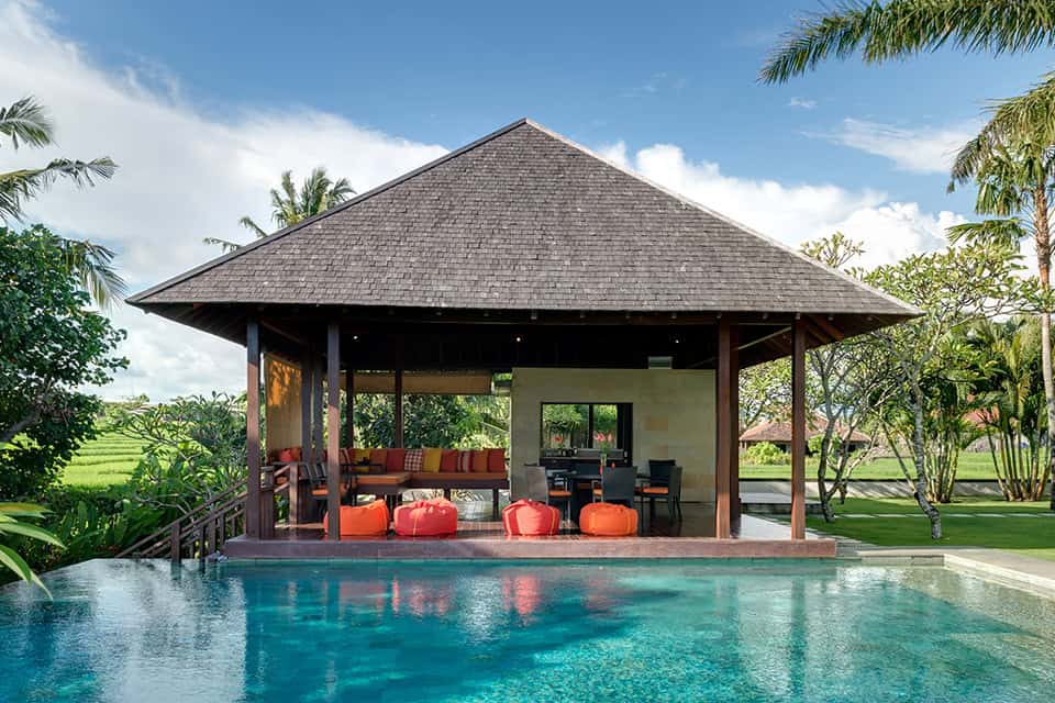The villa is designed for comfort and socializing, with oversized sofas in the living room, a dining table for 20, and an outdoor river-rock bathtub adjoining the fifth bedroom, perfect for two. The double-height living room complements the spacious bedroom suites, each offering plush beds, distinctive decor, and views of rice fields or private gardens.