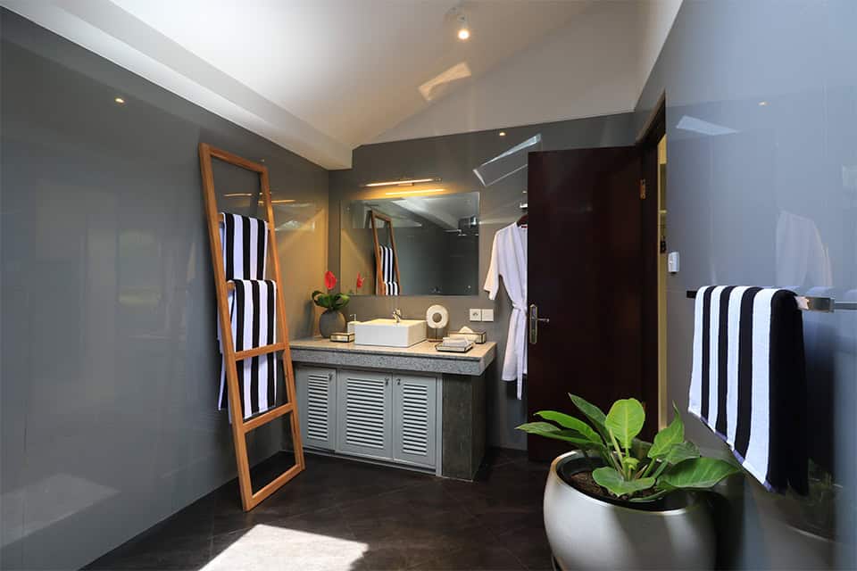 Each of the four spacious air-conditioned master suites is housed in its own pavilion, providing an intimate retreat with opulent ensuite bathrooms, accommodating up to 8 guests with ease. The villa’s centerpiece is its caviar and pearl striped living and dining pavilion, meticulously designed for unforgettable island gatherings. Enjoy a refreshing dip in the expansive 9 x 4-meter pool, or unwind amidst the lush tropical gardens and sun-soaked Parisian-style courtyard.