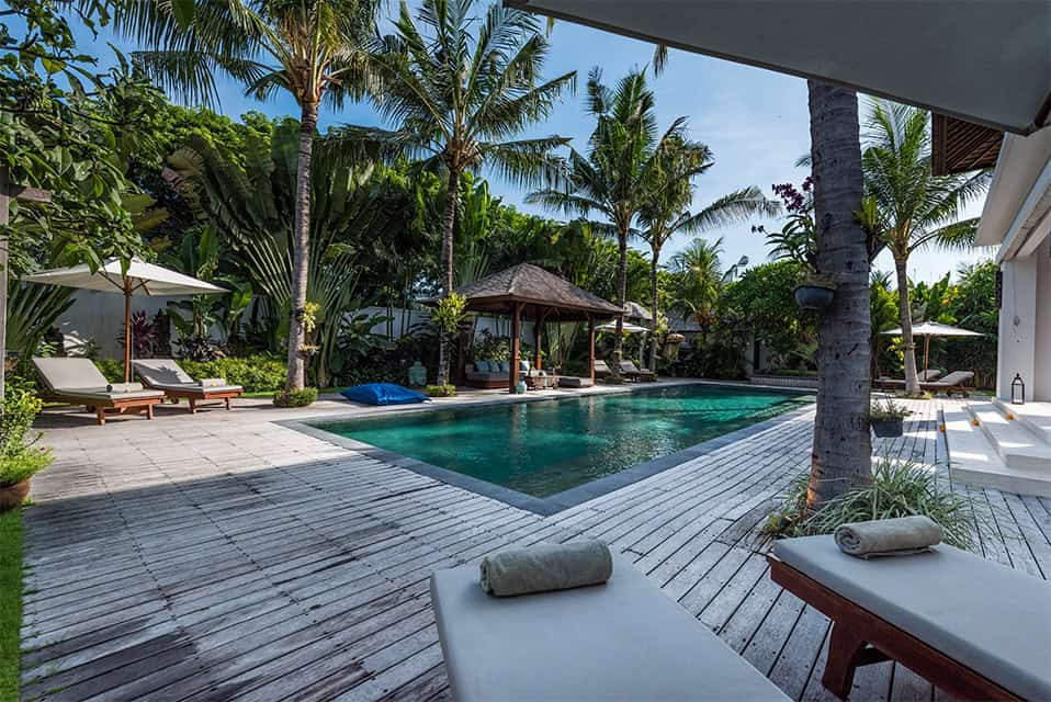 Guests enjoy top-tier amenities including a spacious swimming pool, wooden sundeck with loungers, tropical gardens, media room, office space, and full-time professional staff. Villa manager Wayan ensures personalized service throughout your stay.